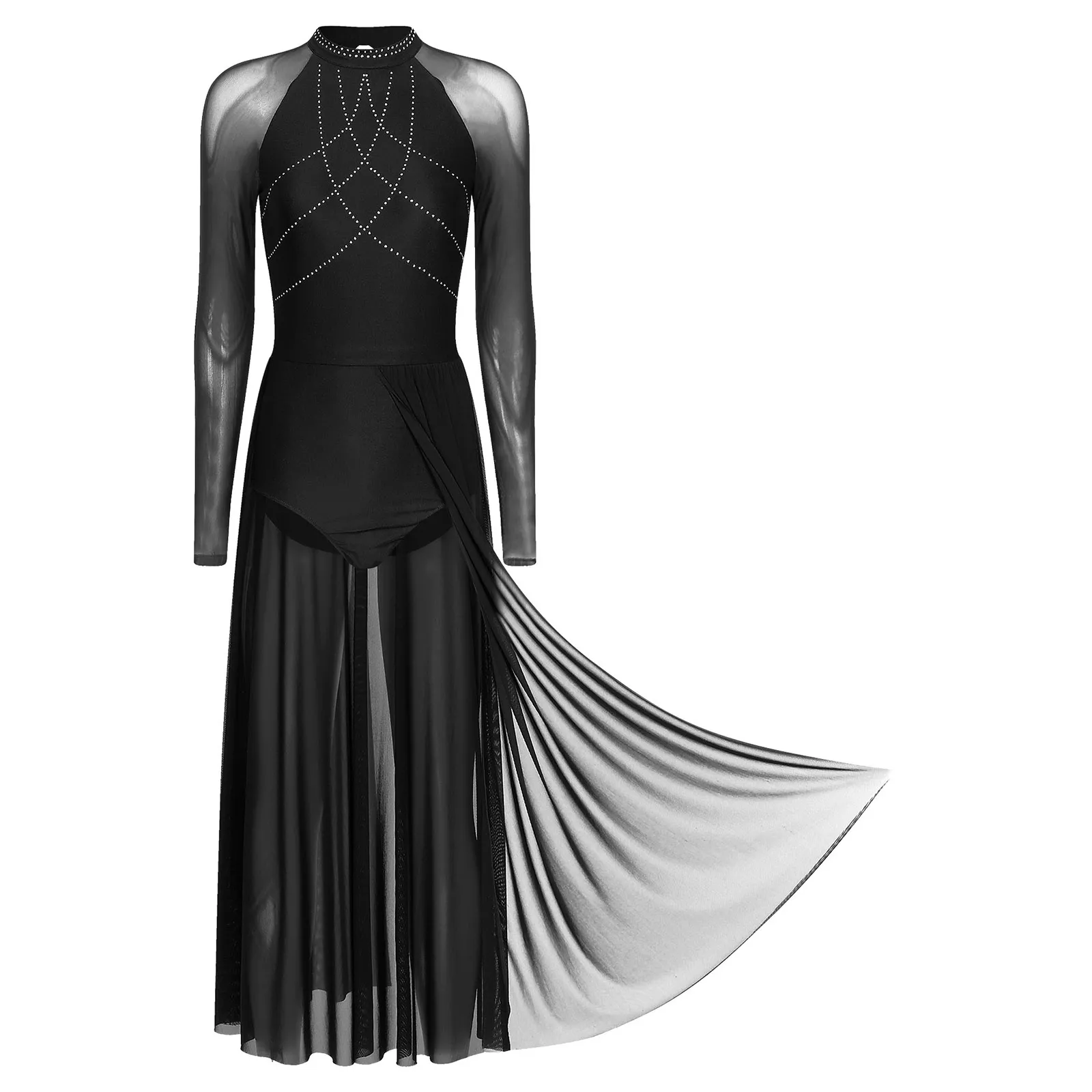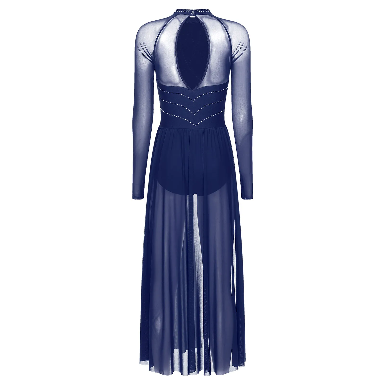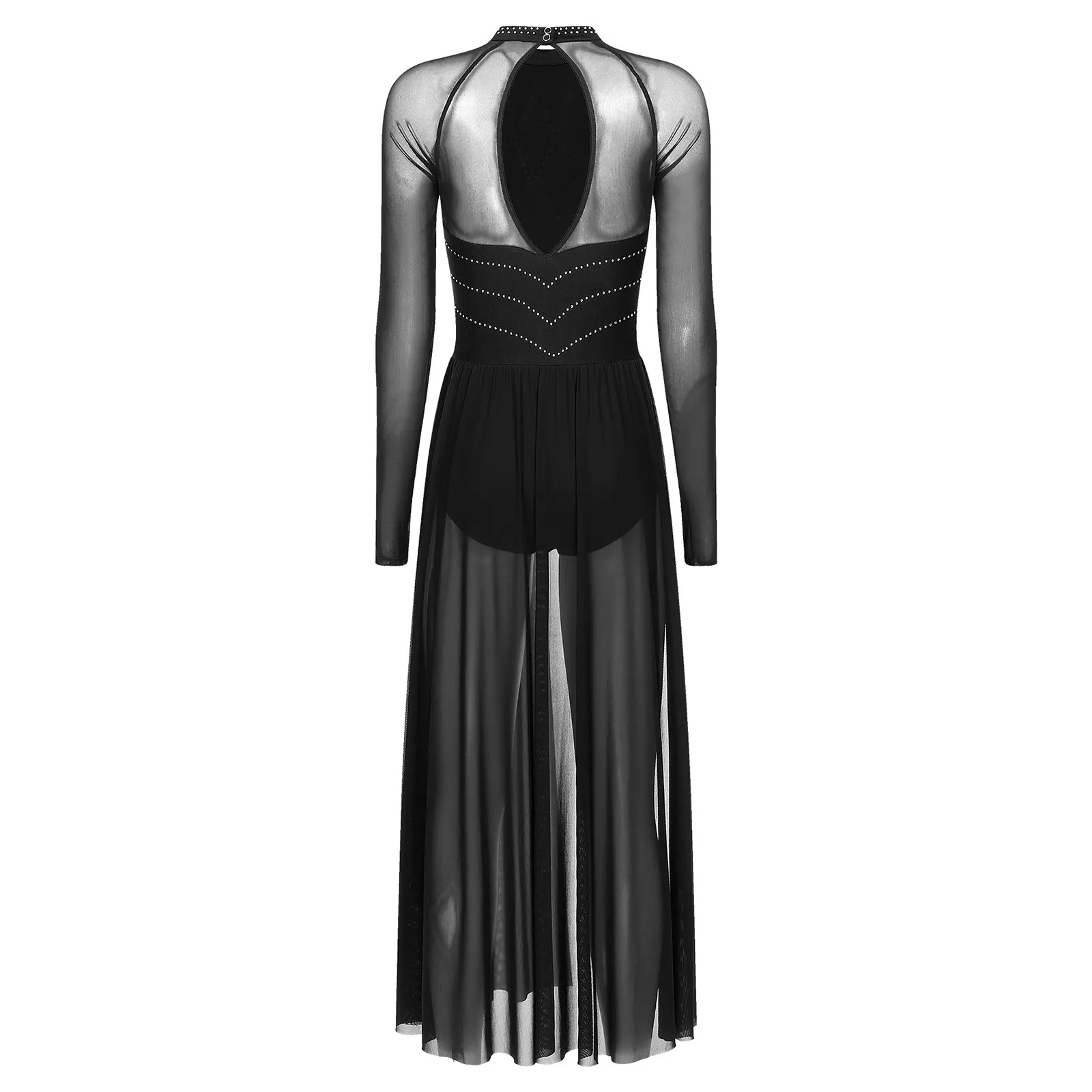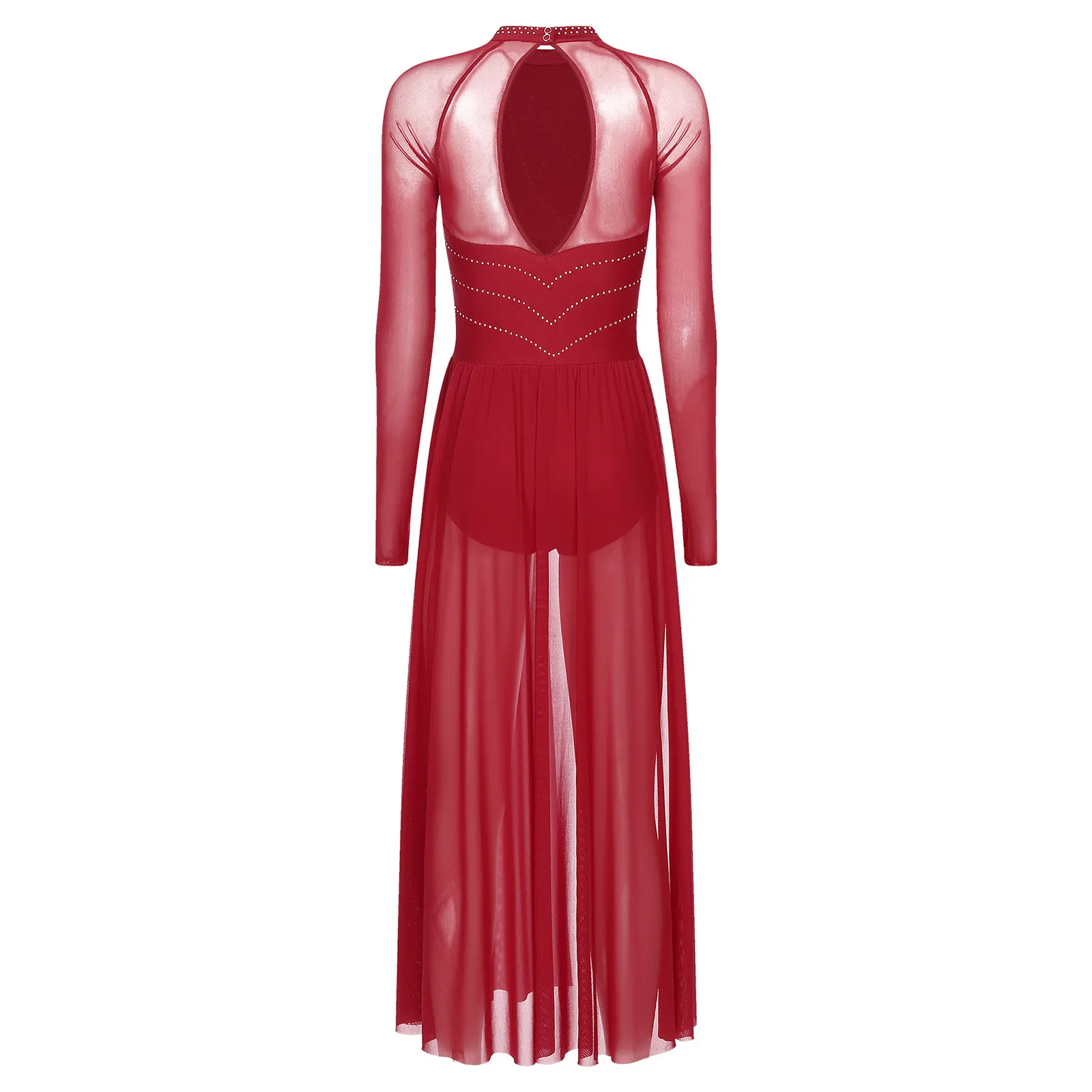 Women Artistic Gymnastics Figure Skating Costume Ballet Lyrical Dance Dress Glitter Rhinestone Mesh Side Slit Maxi