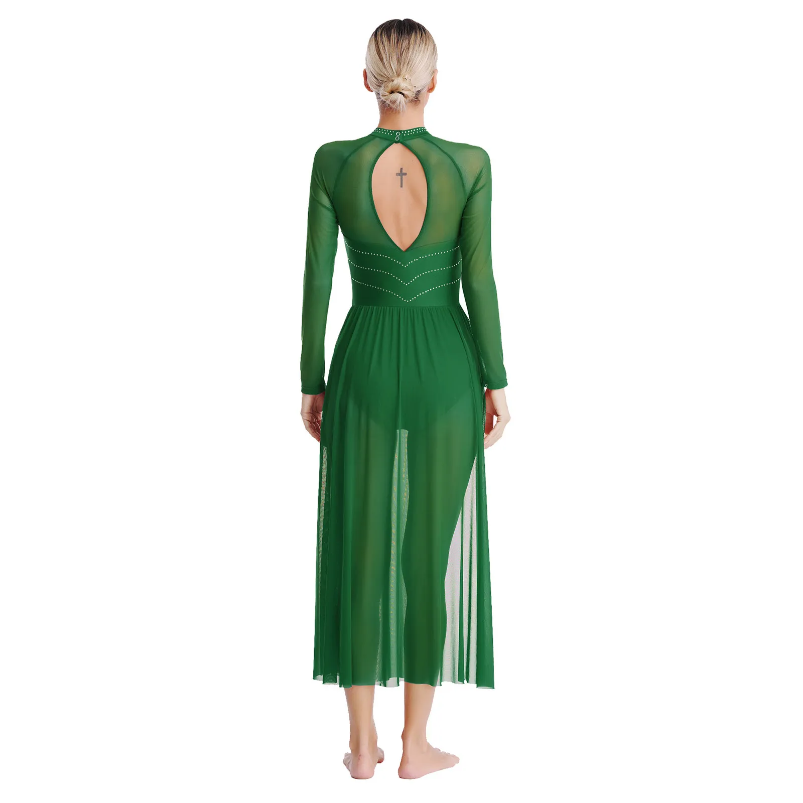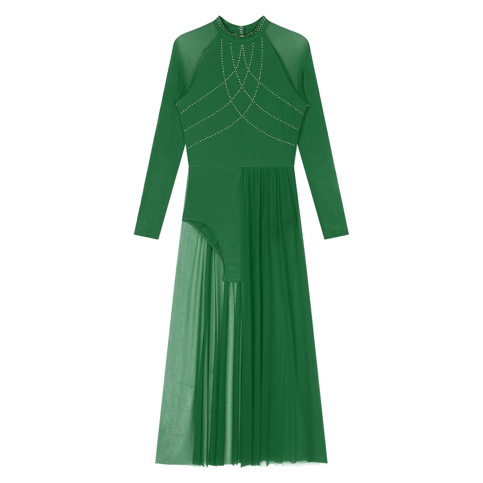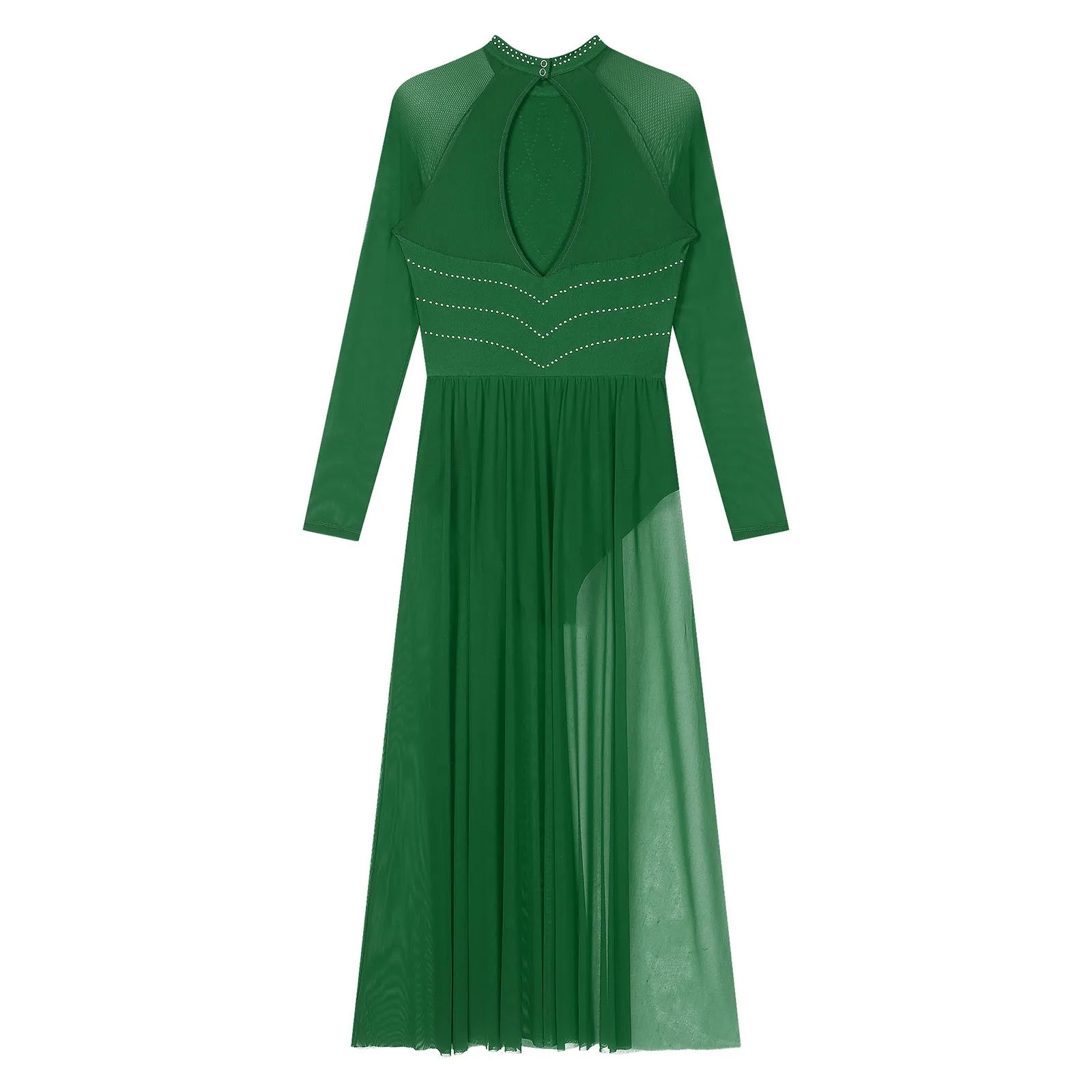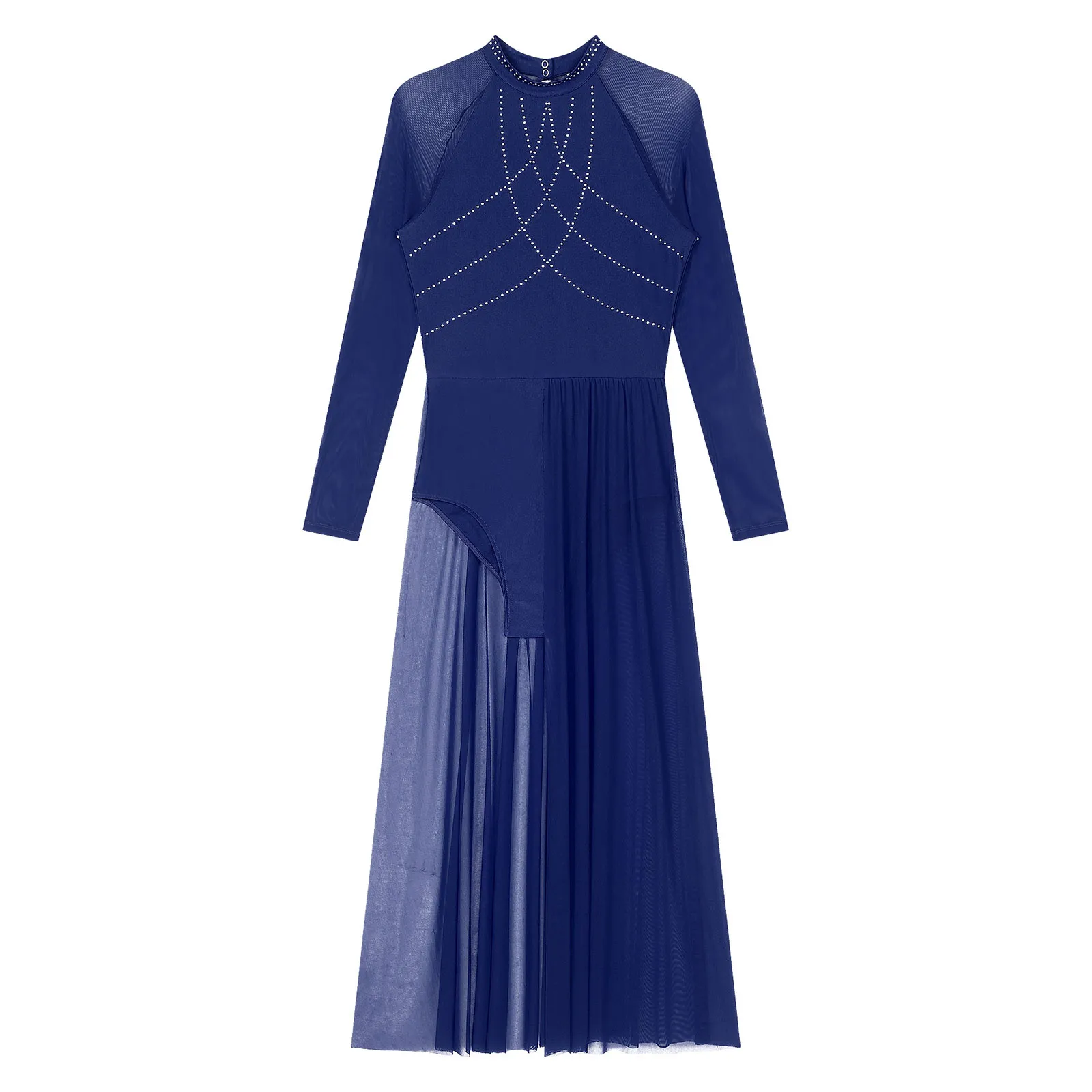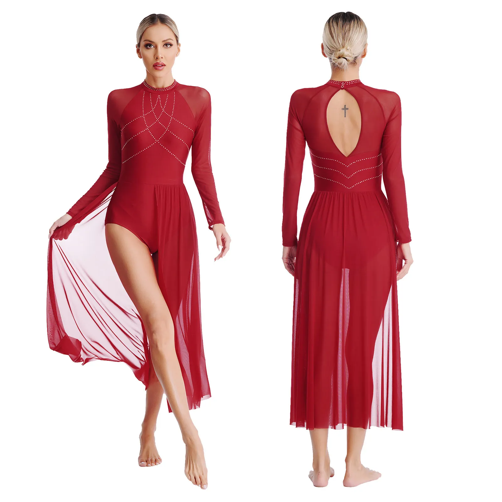 Women Artistic Gymnastics Figure Skating Costume Ballet Lyrical Dance Dress Glitter Rhinestone Mesh Side Slit Maxi
