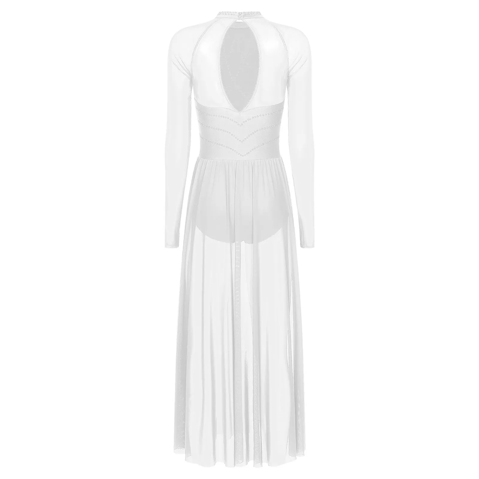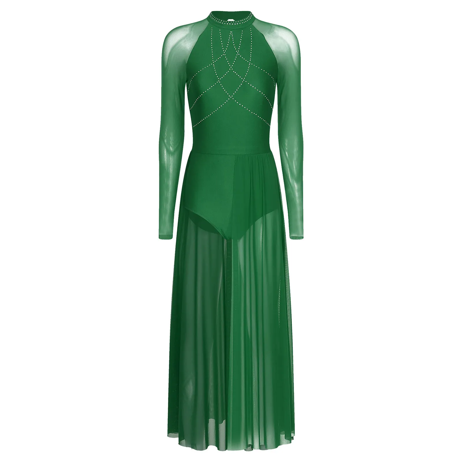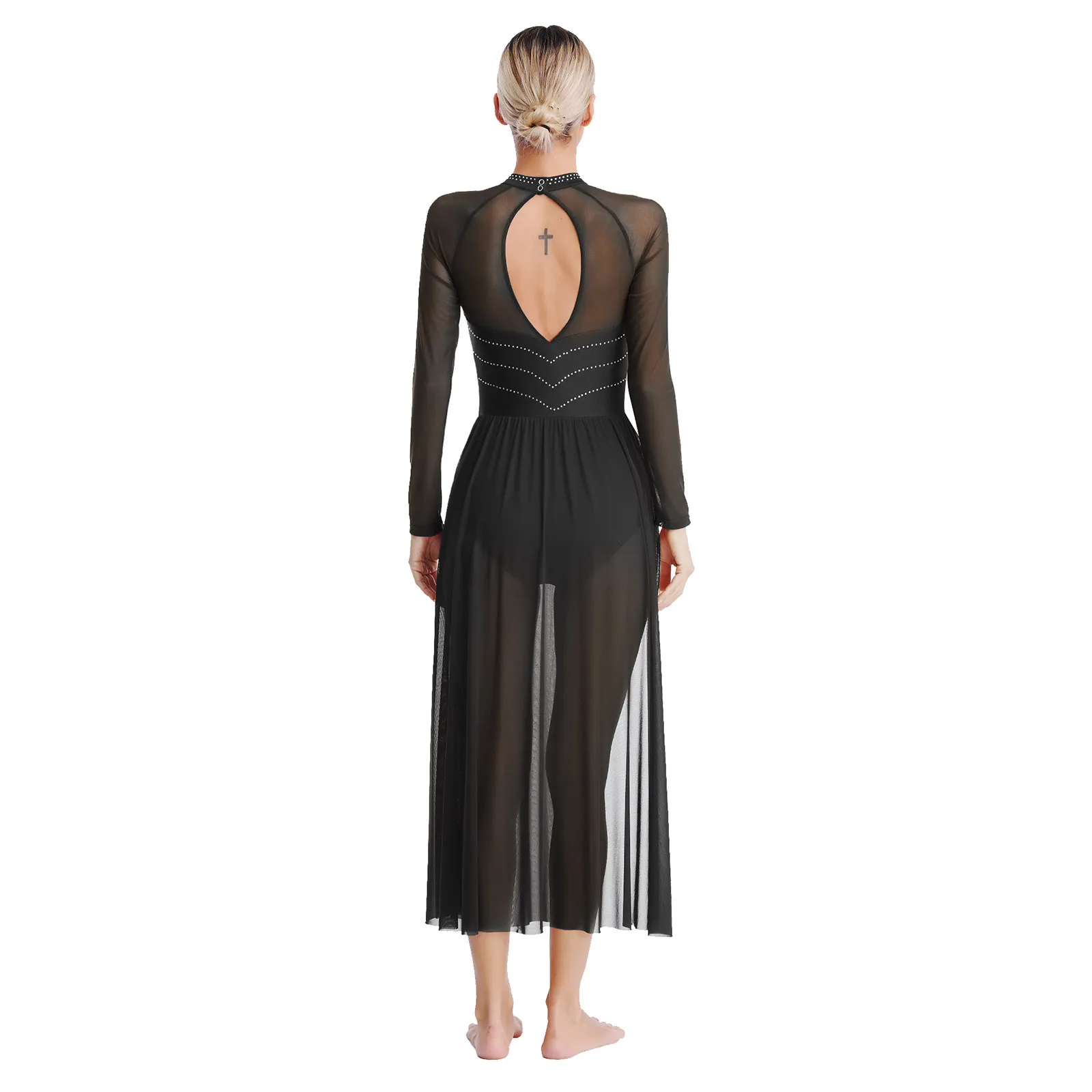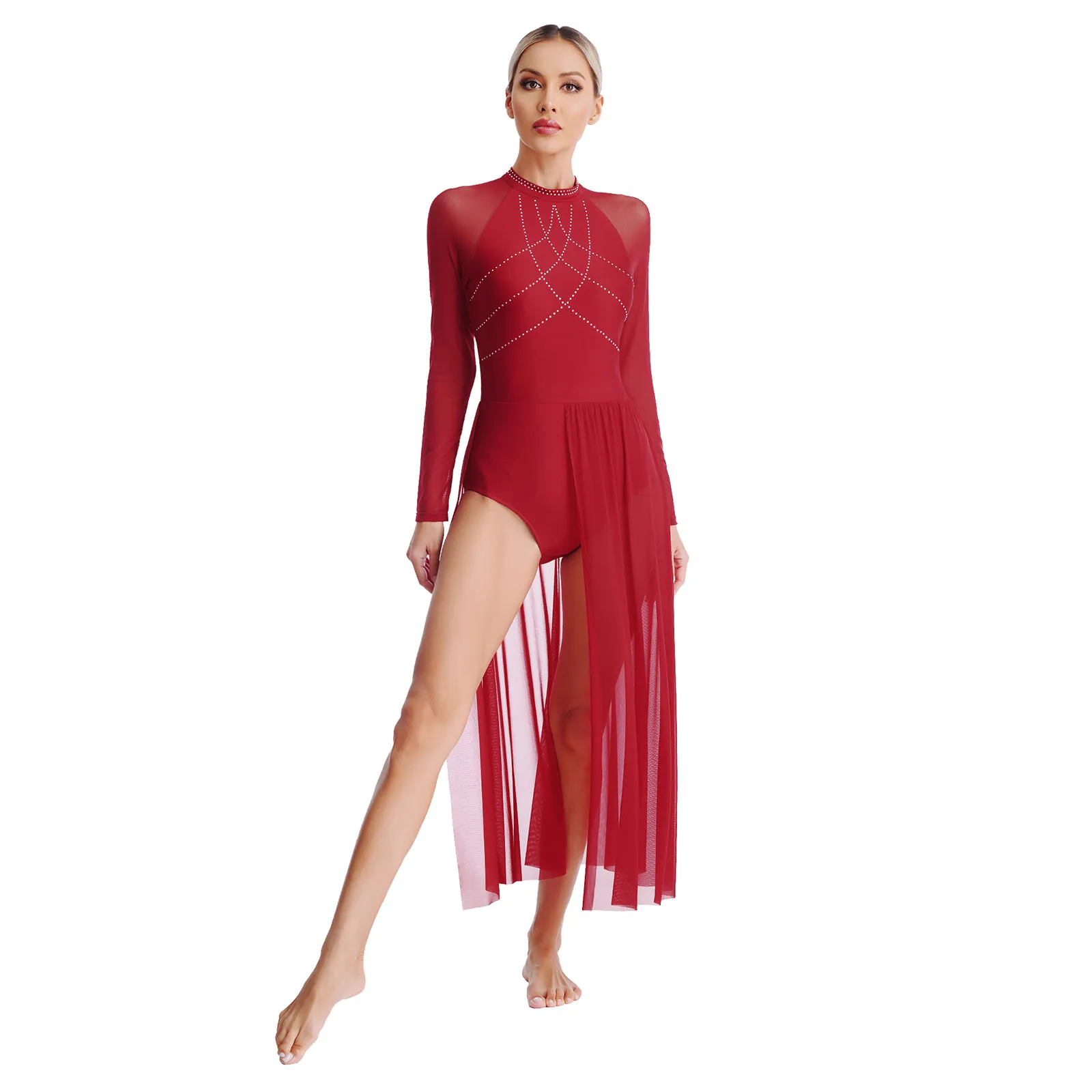 Women Artistic Gymnastics Figure Skating Costume Ballet Lyrical Dance Dress Glitter Rhinestone Mesh Side Slit Maxi