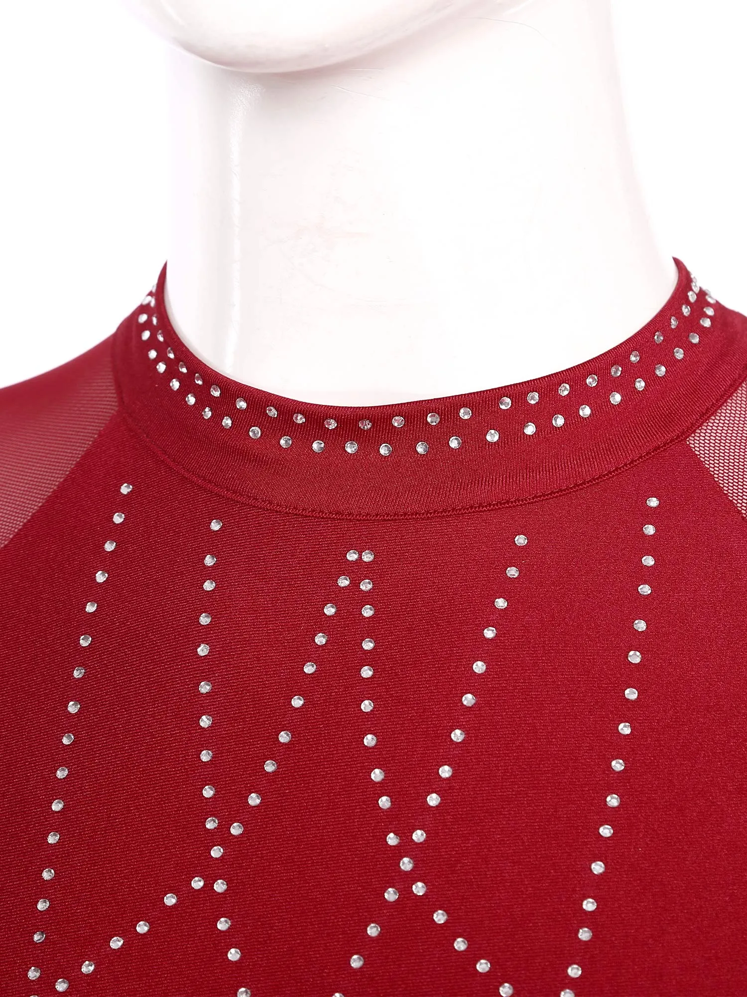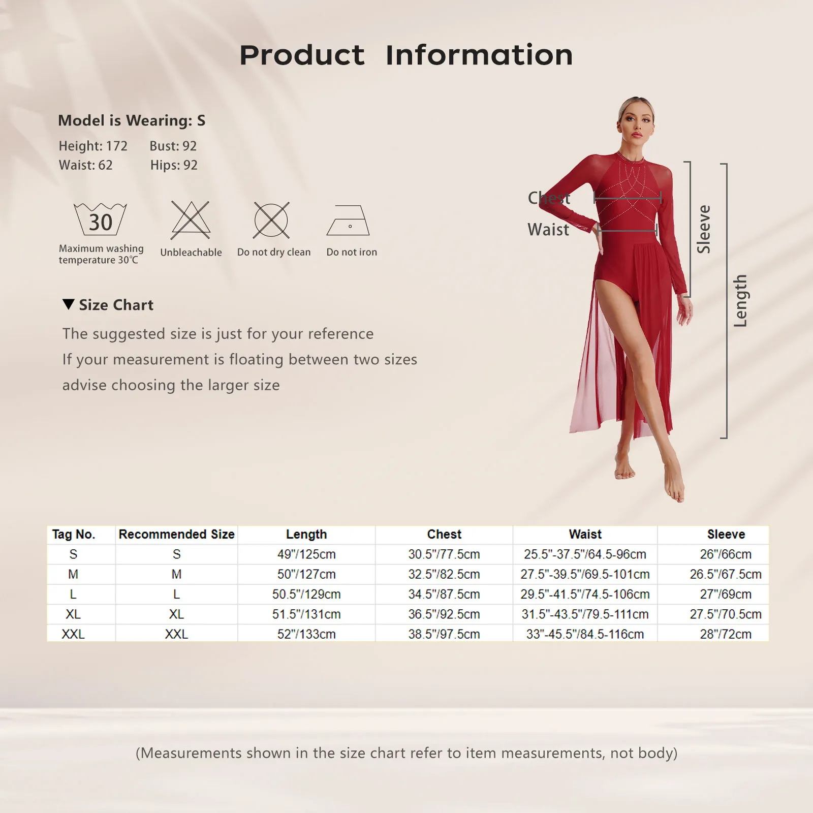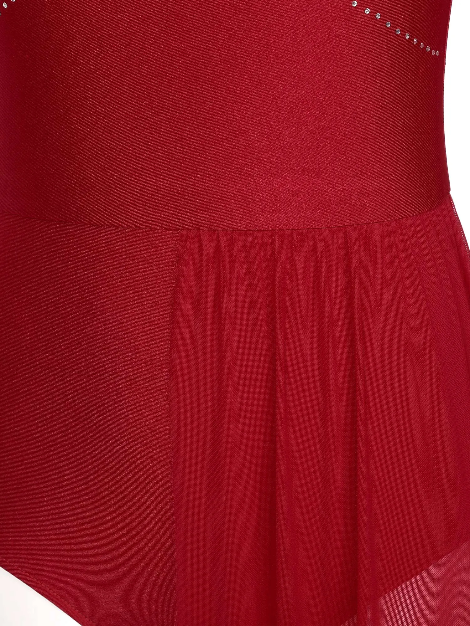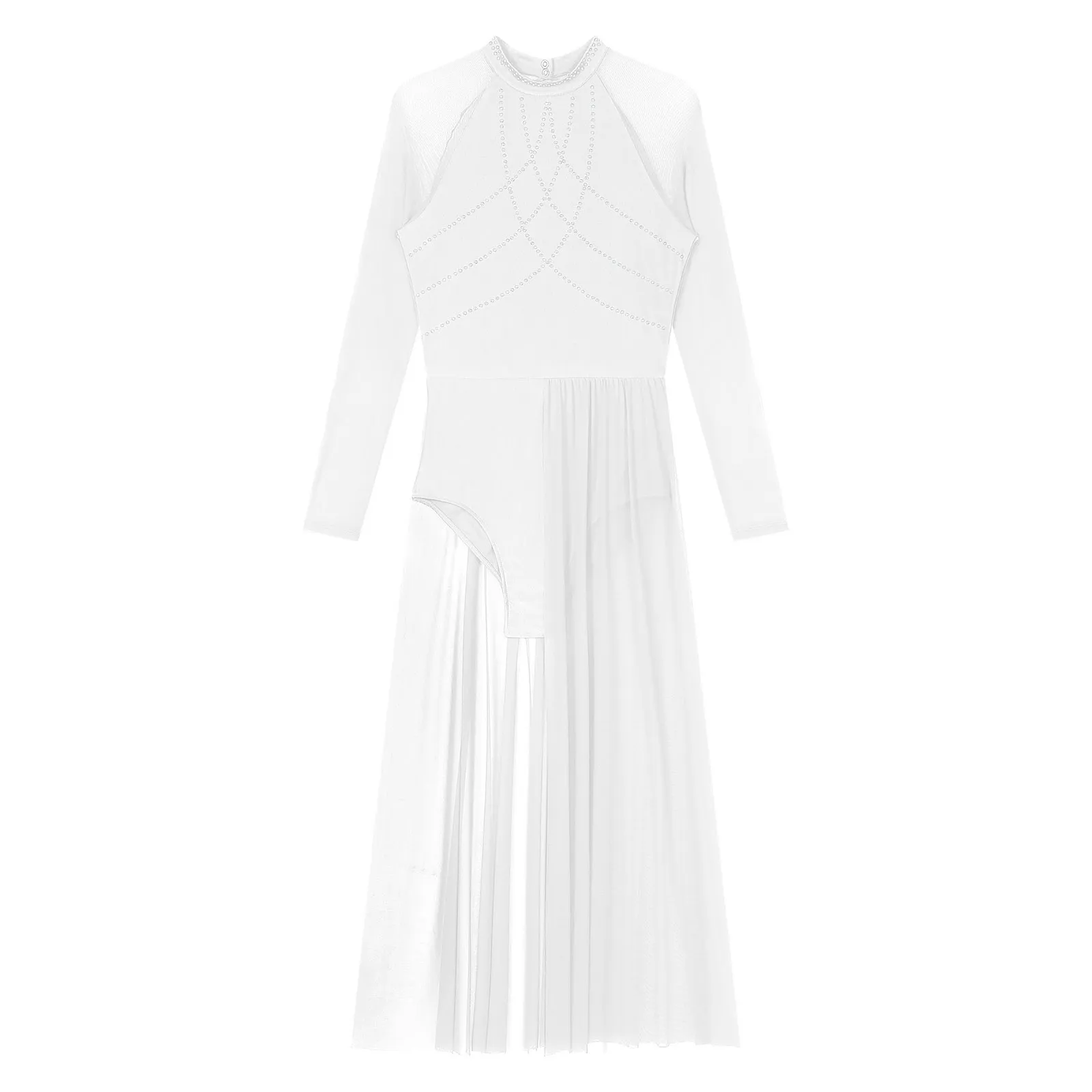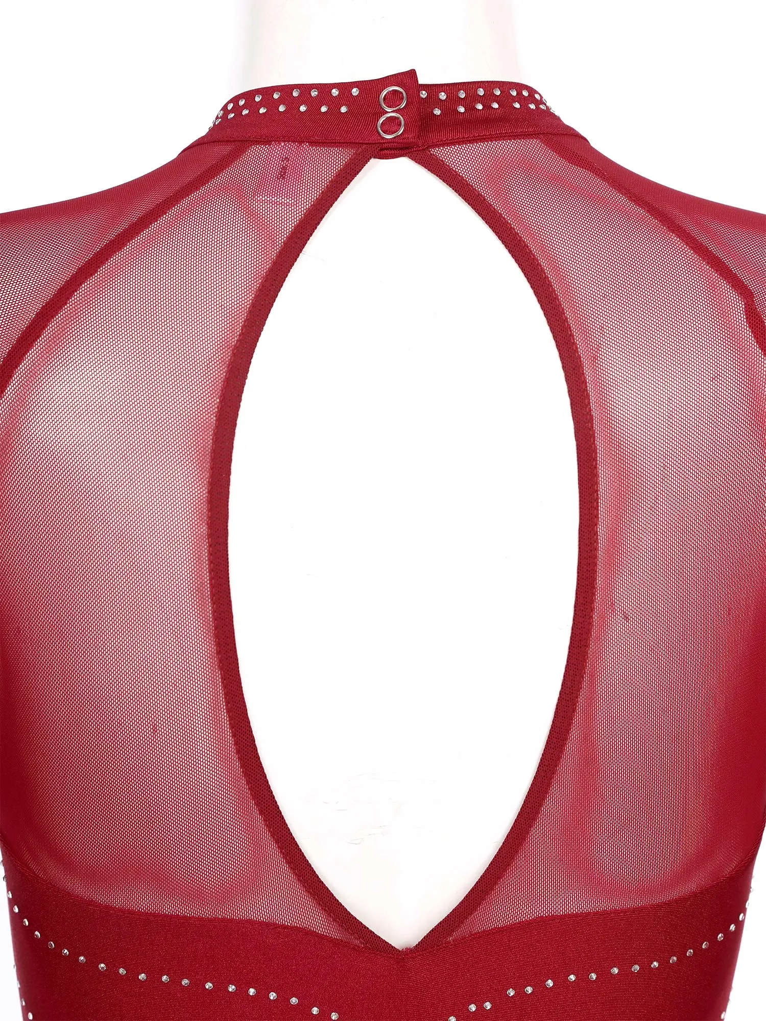 Women Artistic Gymnastics Figure Skating Costume Ballet Lyrical Dance Dress Glitter Rhinestone Mesh Side Slit Maxi