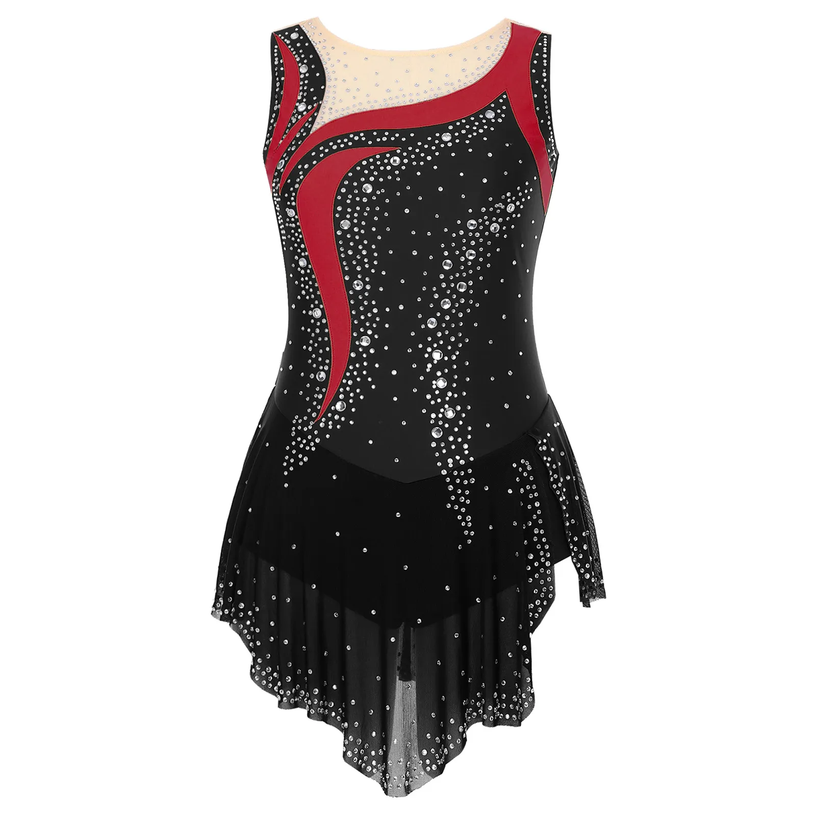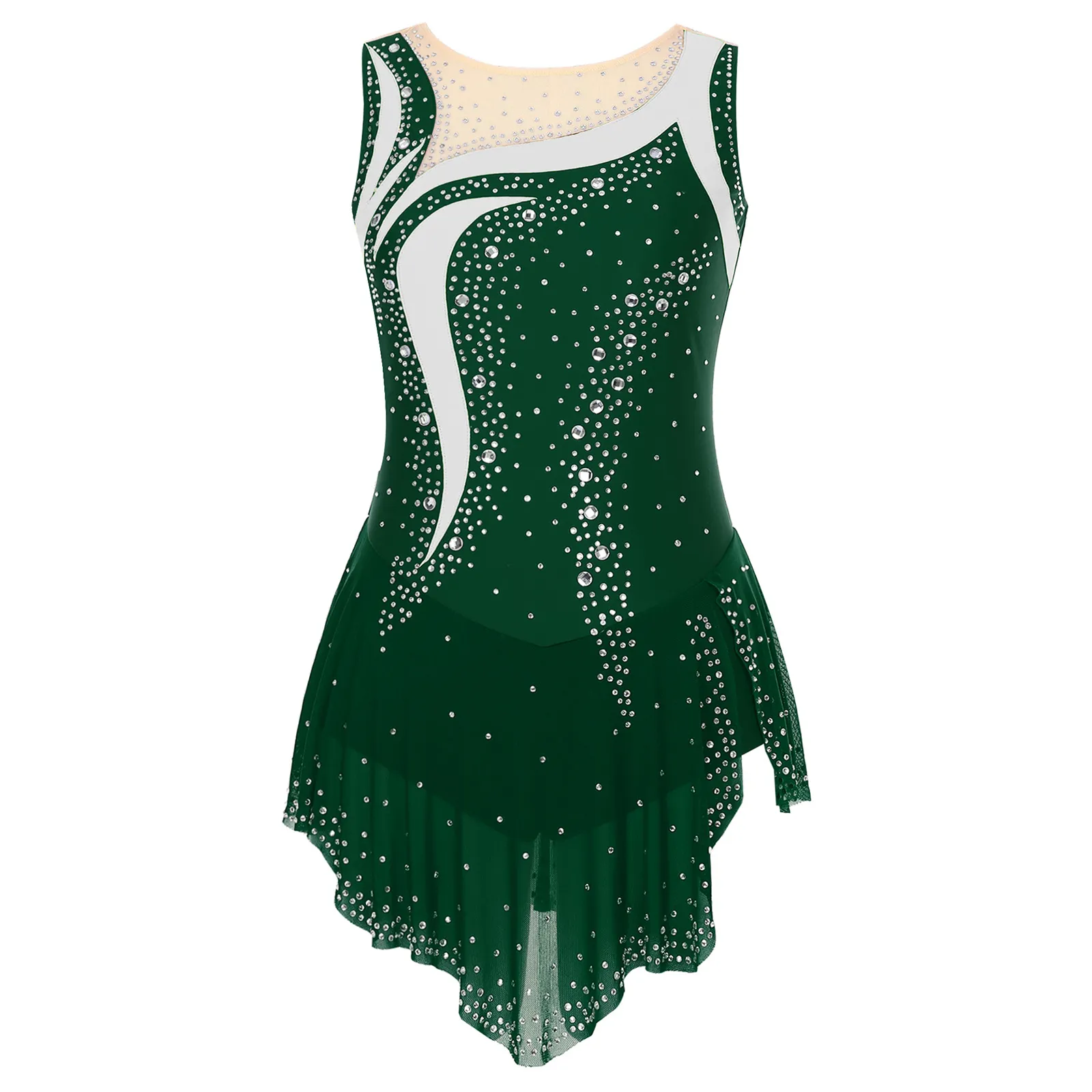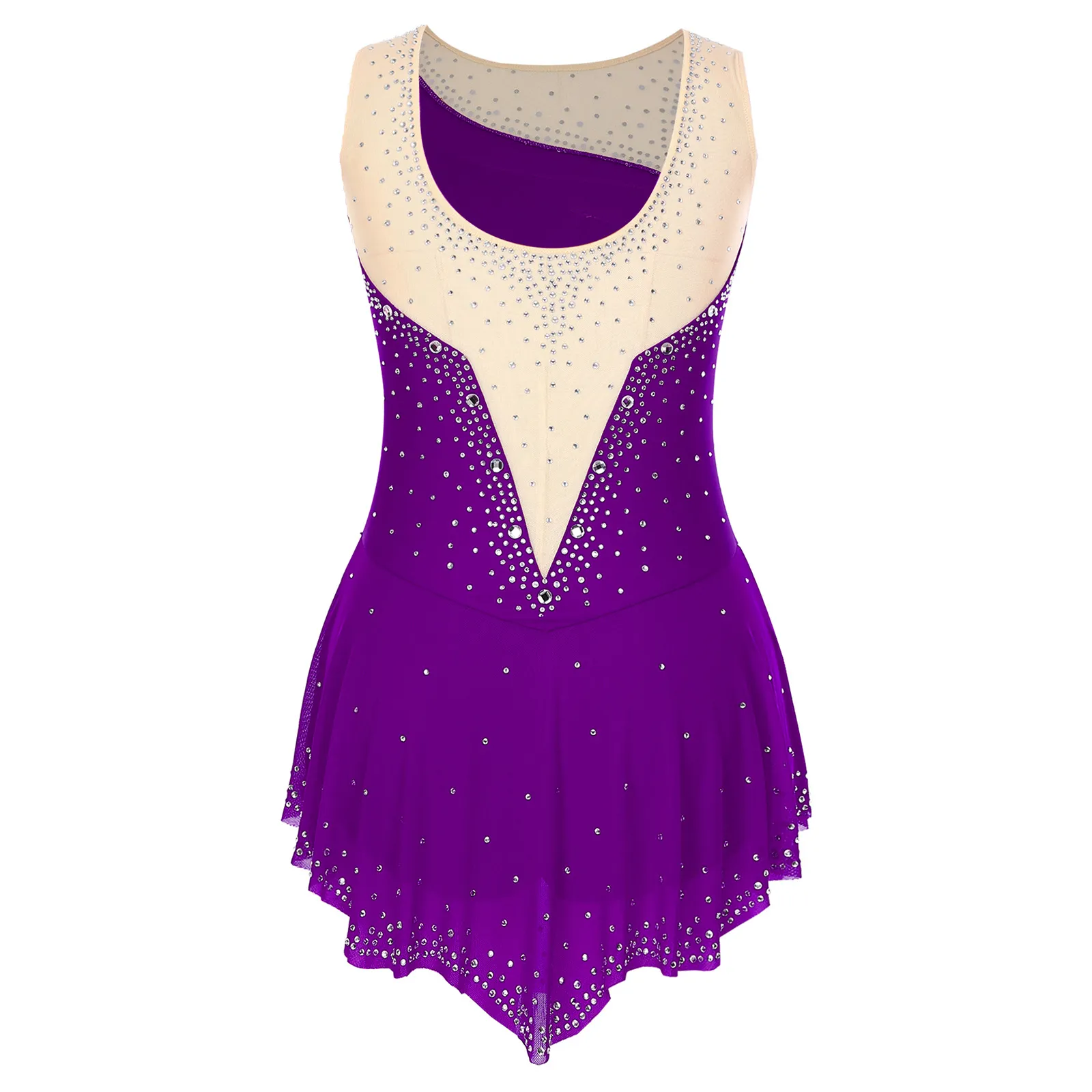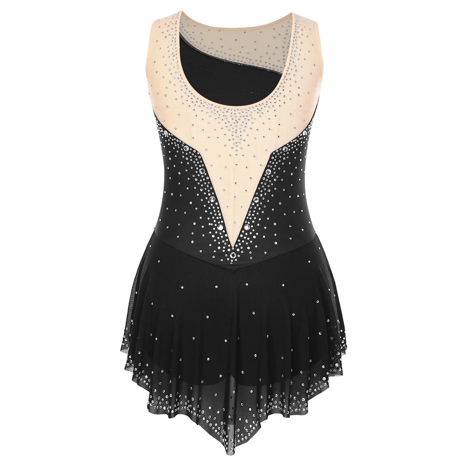 Women Sleeveless Figure Skating Dress Rhinestone Dance Slit Overlay Leotard