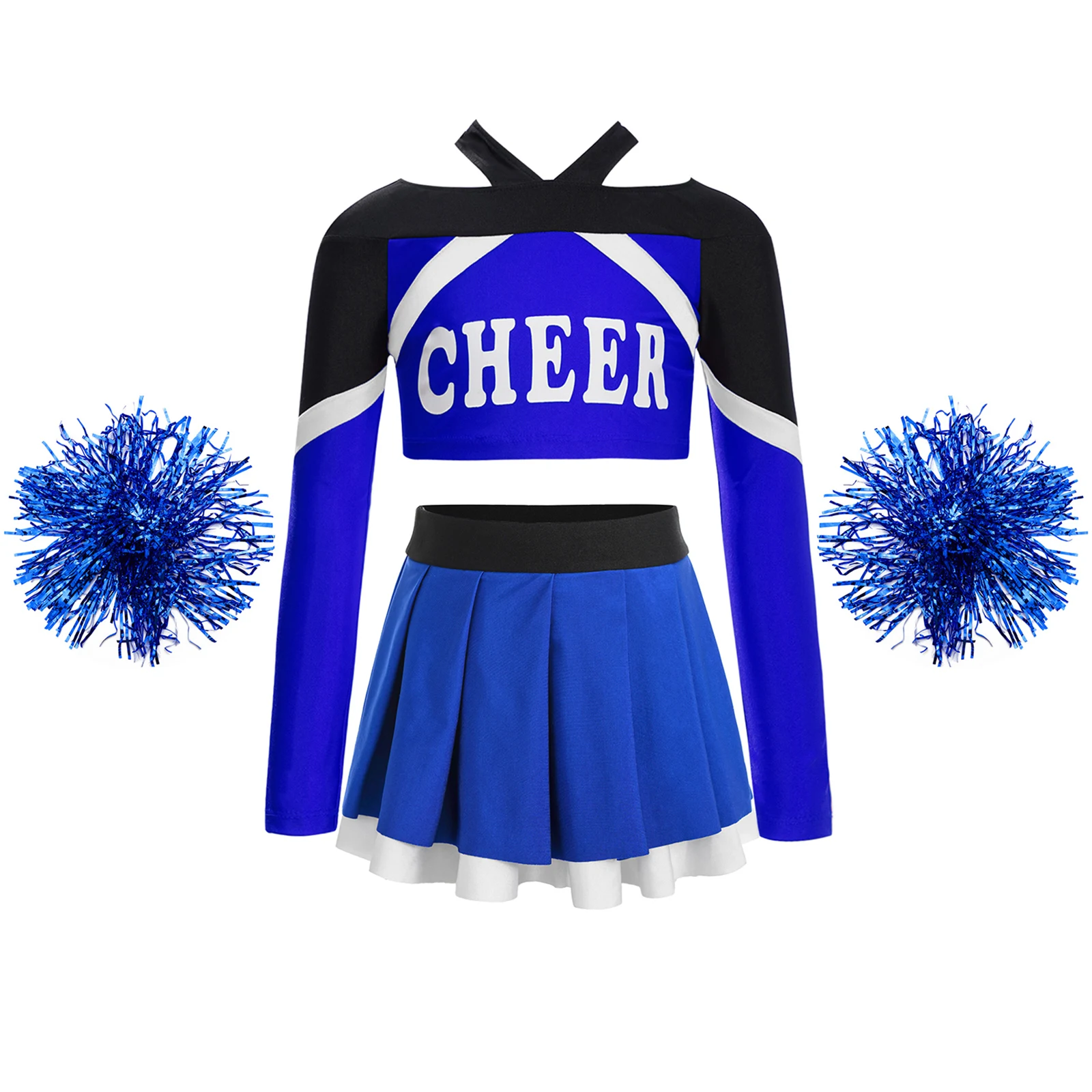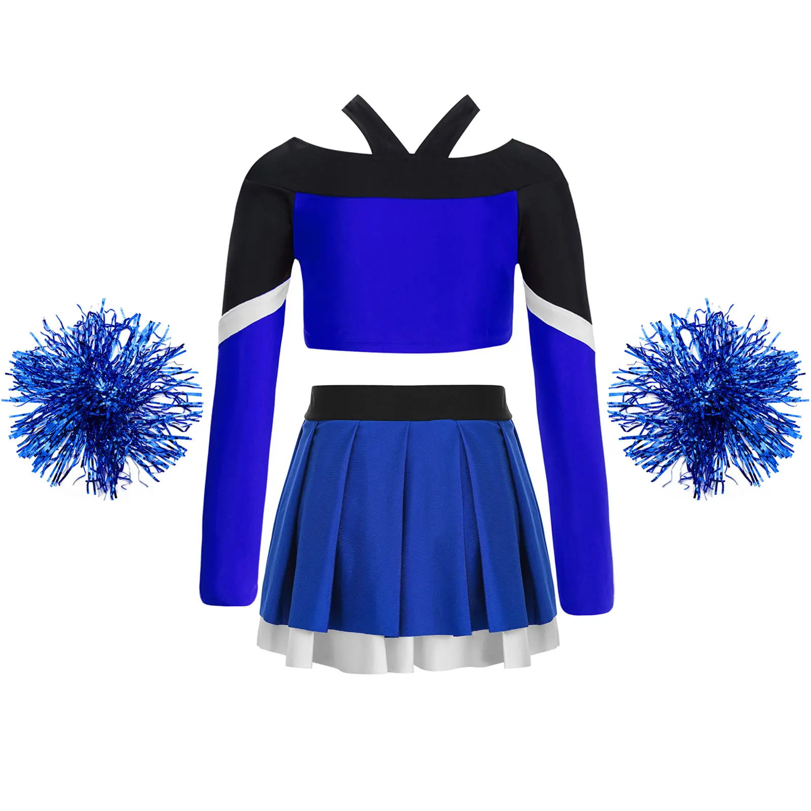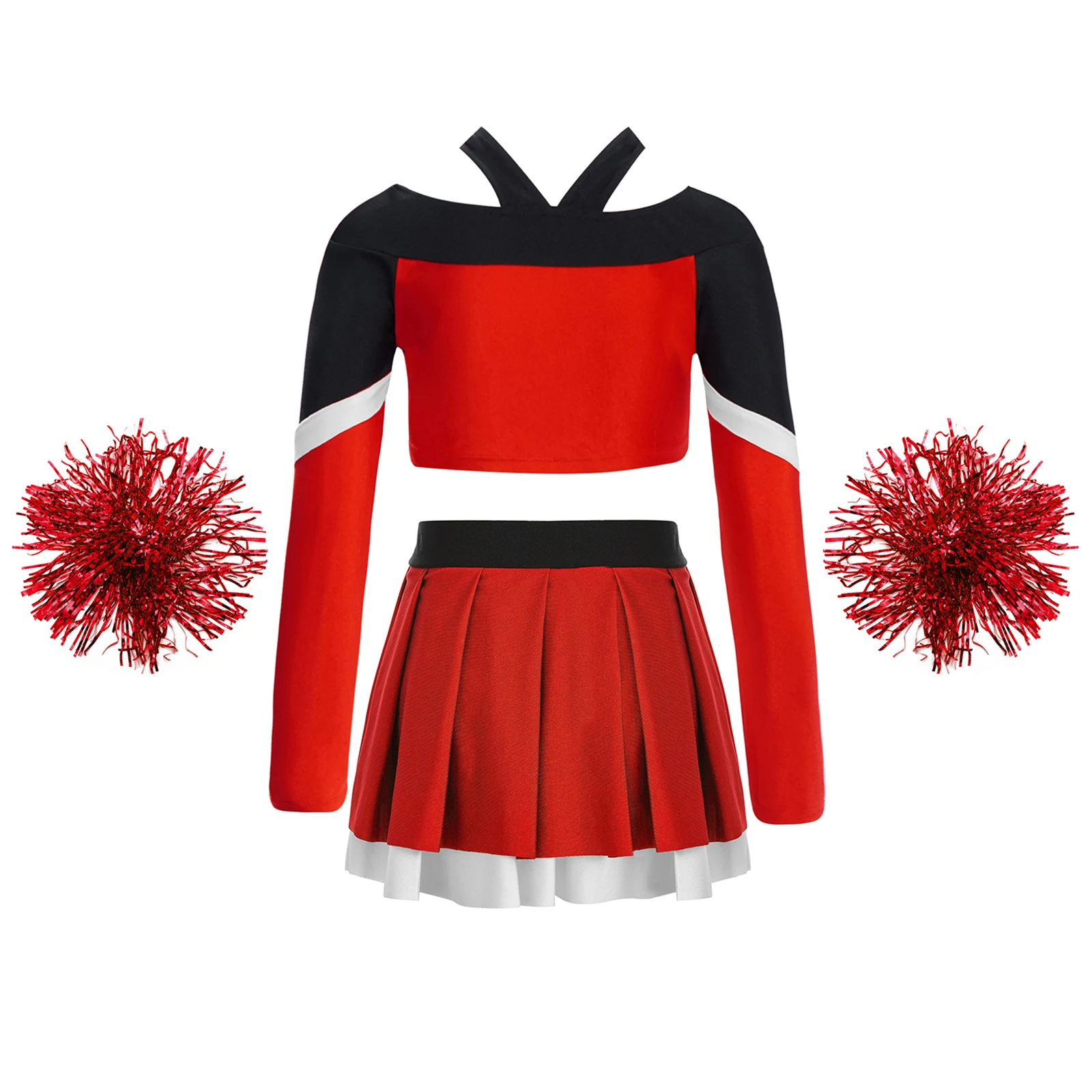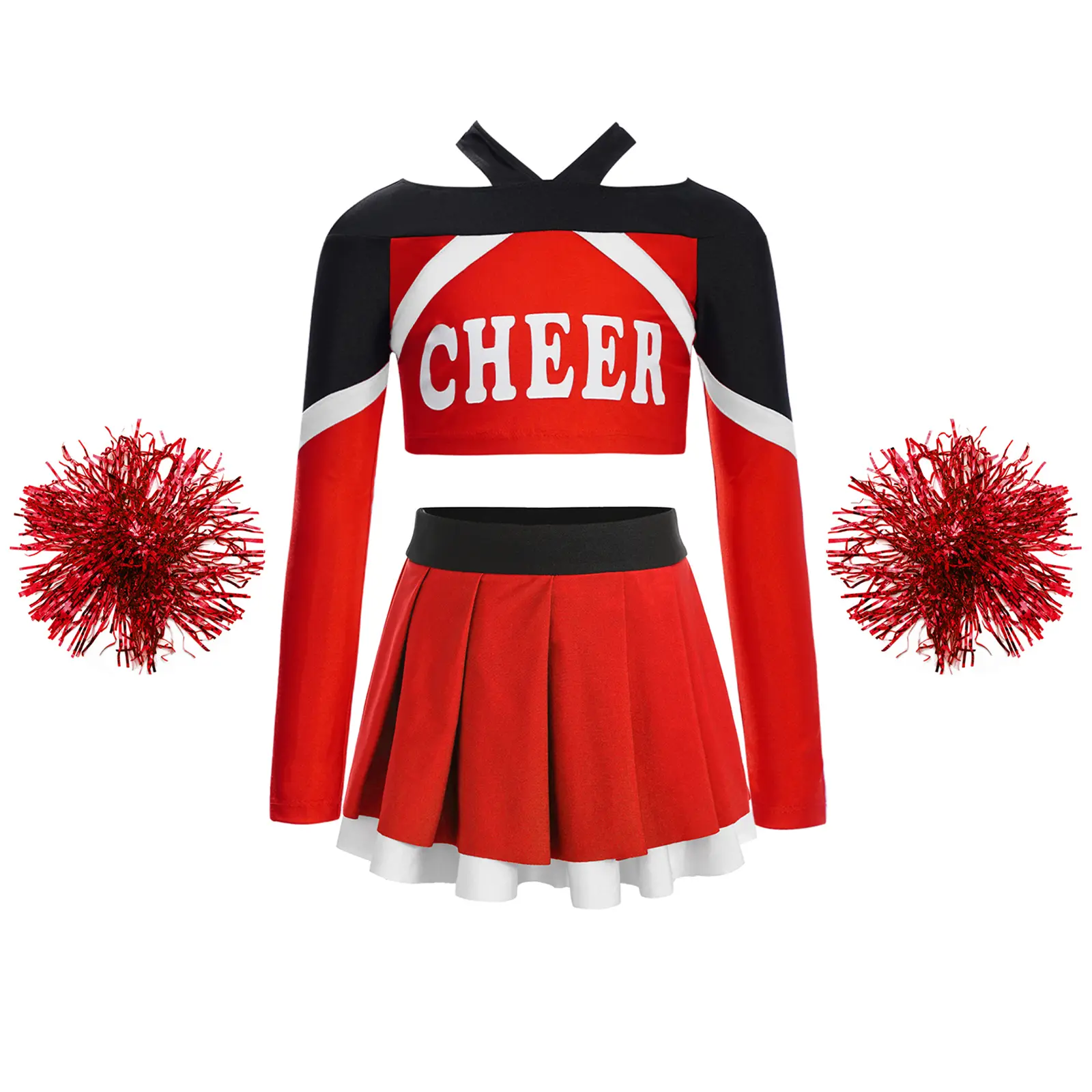 Cheerleader Costume Cheerleading Performance Uniform Letter Print Crop Top With Pleated Skirt And Pom Poms